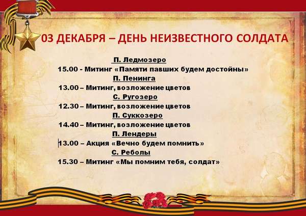 В поселениях Муезерского района пройдут торжественные митинги с возложением цветов и акции.