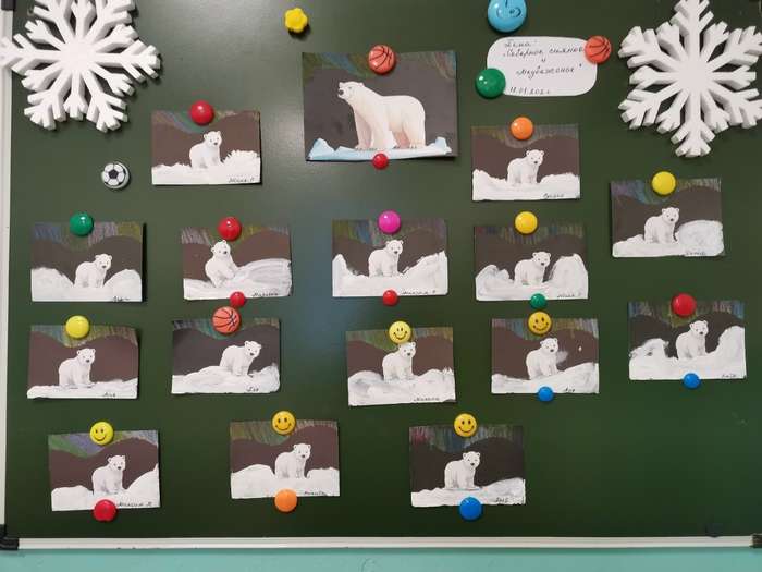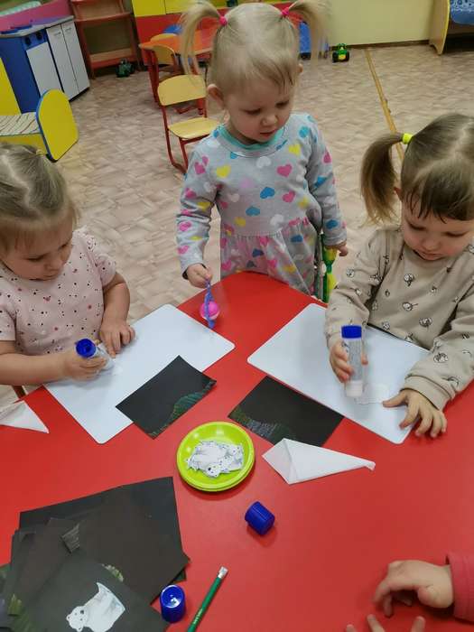 В группе раннего возраста детского сада №1 п. Муезерский была выполнена работа, в которой белый медвежонок увидел северное сияние.