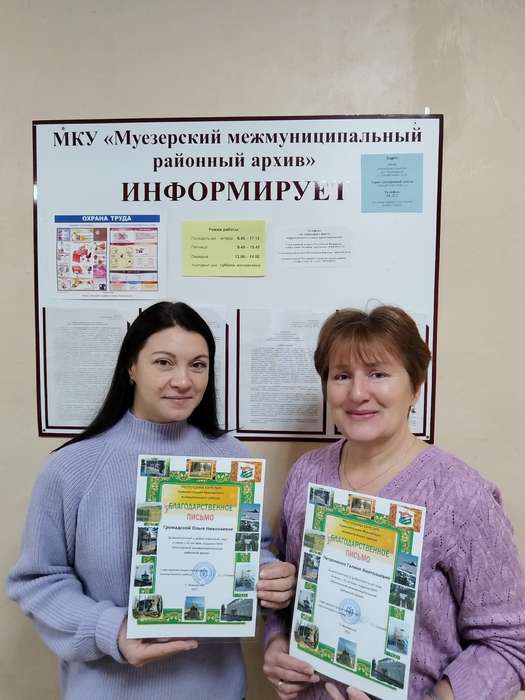 В связи с 20-летием муниципального казенного учреждения "Муезерский межмуниципальный районный архив" архивисты Галина Анатольевна Петроченко и Ольга Николаевна Громадская награждены благодарственными письмами Администрации Муезерского муниципального района.