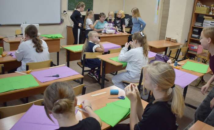 Елена Георгиевна Садыкова показала детям, как на оверлоке и швейной машине заправляются нити, настраиваются режимы, фиксируется на рабочей поверхности ткань, как действует педаль и боковое колесо. Девчонки с интересом разобрались в этом и увлеченно принялись за дело. В итоге получились аккуратно сшитые яркие полотенца.